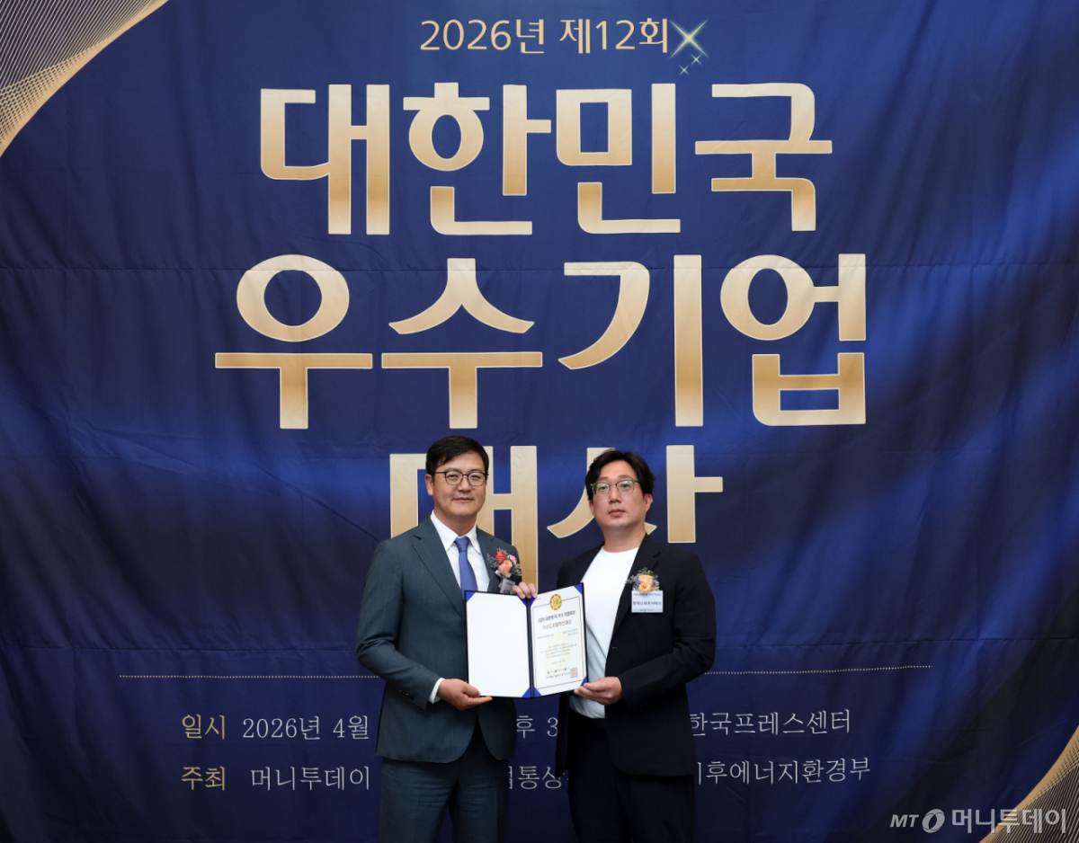 안성호 한국스마트서비스 팀장(사진 오른쪽)이 16일 오후 서울 중구 한국프레스센터에서 열린 머니투데이 주최의 '2026 제12회 대한민국 우수기업대상' 시상식에서 '전자투표 플랫폼' 부문 '우수디지털혁신대상'을 수상하고 송기용 머니투데이 전무와 기념사진을 촬영 중이다.