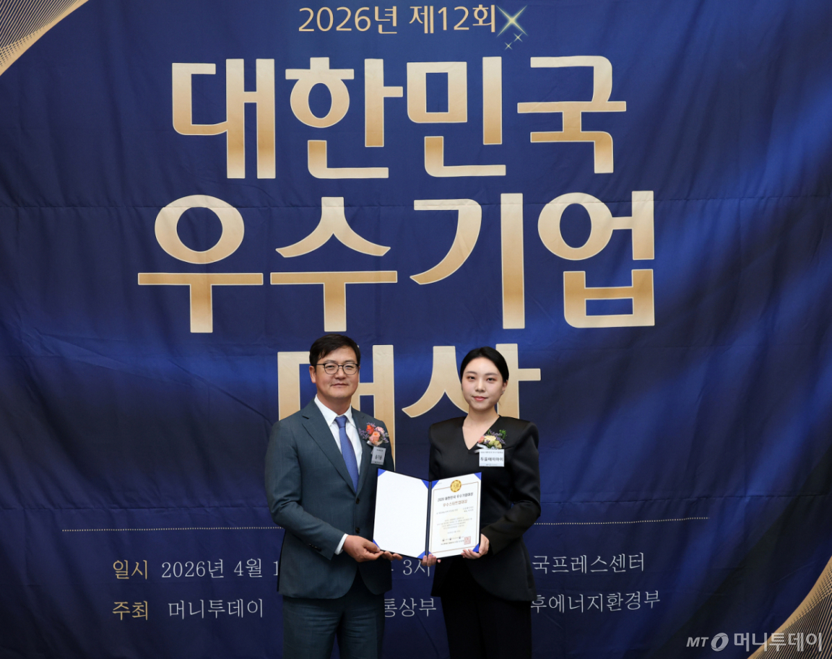 이서후 두을에이아이 대표(사진 오른쪽)가 16일 오후 서울 중구 한국프레스센터에서 열린 머니투데이 주최의 '2026 제12회 대한민국 우수기업대상' 시상식에서 'AI 자동화&전략 컨설팅' 부문 '우수스타트업대상'을 수상하고 송기용 머니투데이 전무와 기념사진을 촬영 중이다.