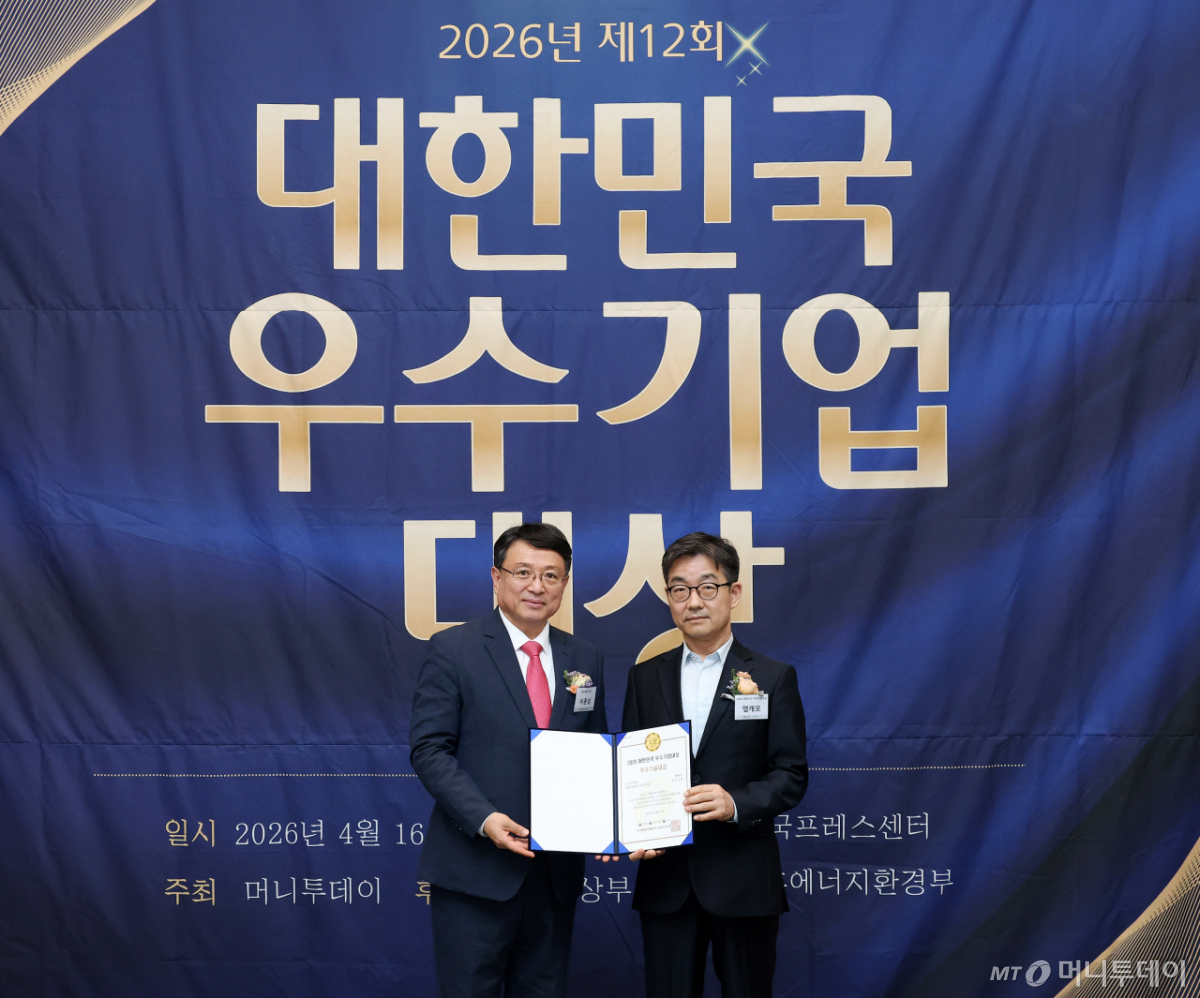 김성 앱캐모 대표(사진 오른쪽)가 16일 오후 서울 중구 한국프레스센터에서 열린 머니투데이 주최의 '2026 제12회 대한민국 우수기업대상' 시상식에서 '3년 연속상'으로 '악성 앱 탐지 기술' 부문 '우수기술대상'을 받고 이종섭 동국대학교 교수와 기념사진을 찍고 있다.