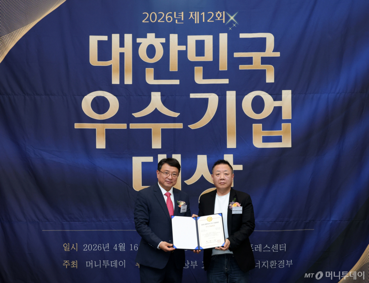 전병석 비타바이오랩 대표(사진 오른쪽)가 16일 오후 서울 중구 한국프레스센터에서 열린 머니투데이 주최의 '2026 제12회 대한민국 우수기업대상' 시상식에서 2년 연속상으로 '바이오 혁신' 부문 '우수기술대상'을 수상한 뒤 이종섭 동국대학교 교수와 기념 촬영 중이다.