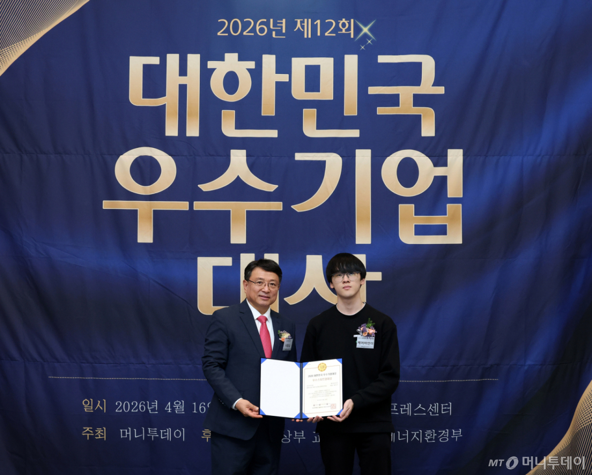 이은구 케어마인더 선임(사진 오른쪽)이 16일 오후 서울 중구 한국프레스센터에서 열린 머니투데이 주최의 '2026 제12회 대한민국 우수기업대상' 시상식에서 2년 연속상으로 환자 음성 기반 AI 간호 솔루션 부문 '우수스타트업대상'을 수상한 뒤 이종섭 동국대학교 교수와 기념 촬영 중이다.