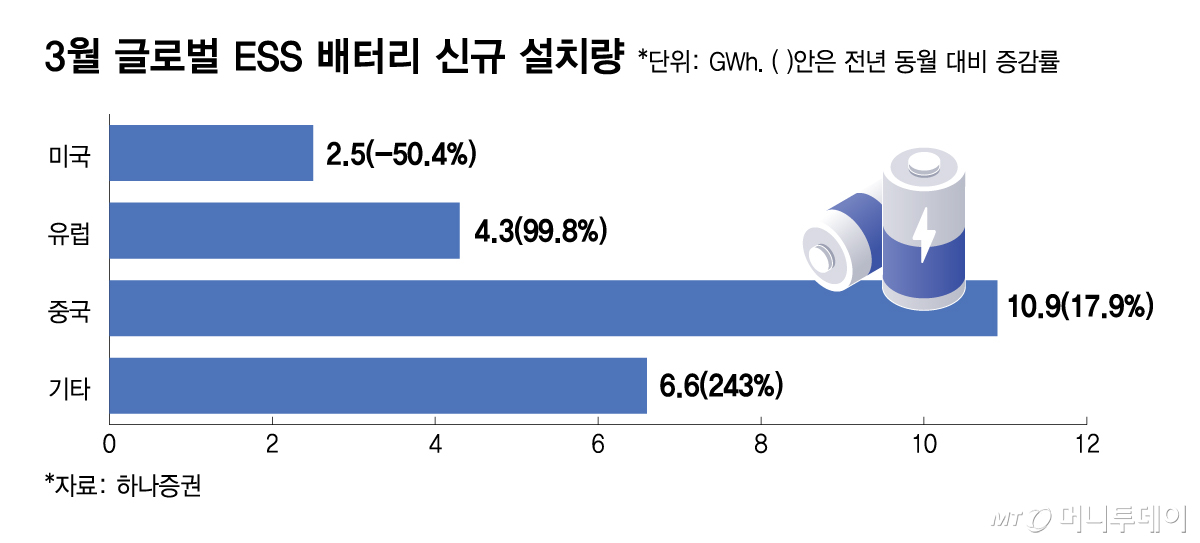17일 하나증권에 따르면 지난달 유럽 ESS 신규 설치량은 전년 동월 대비 99.8% 증가한 4.3GWh(기가와트아워)를 기록했다. 반면 같은 기간 미국의 ESS 신규 설치량은 50.4% 감소한 2.5GWh에 그쳤다. 1~3월 누적 설치량을 보면 미국은 전년 동기 대비 18.5% 늘었지만(9.3GWh) 유럽은 같은 기간 69% 늘었다(8.8GWh). 유럽 내 재생에너지 확대 기조가 ESS 수요를 견인한 결과로 보인다. 간헐성이 높은 재생에너지 비중이 확대되면서 이를 보완할 전력 저장 수단으로서 ESS의 필요성이 커지고 있다는 분석이다.