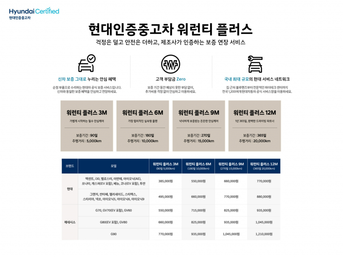 현대차 관계자는 "인증중고차를 선택한 고객이 차량 구매 이후에도 안심하고 운행할 수 있도록 현대인증중고차 워런티 플러스 서비스를 마련했다"며 "앞으로도 고객이 체감할 수 있는 품질과 서비스를 지속적으로 강화해 나갈 것"이라고 말했다.