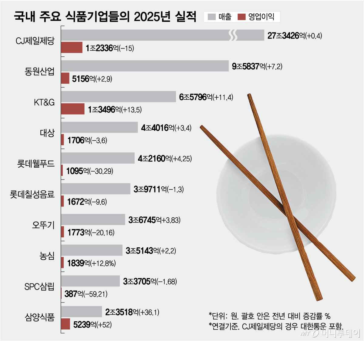 # 식품기업 오뚜기는 지난해 연결기준 매출액이 2024년보다 3.8% 증가한 3조6745억원을 기록했다. 외형적으론 성장한 것처럼 보인다. 하지만 같은 기간 영업이익은 1773억원으로 20% 줄었다. 원/달러 환율과 원료·부자재 단가가 상승한 탓이다. 영업이익률은 4.8%로 업계 평균수준인 5%를 밑돌았다. 올해는 더 걱정이다. 미국-이란 전쟁 등 중동발 지정학적 리스크로 물류비 부담과 포장재 가격인상 등 악재가 많아서다.