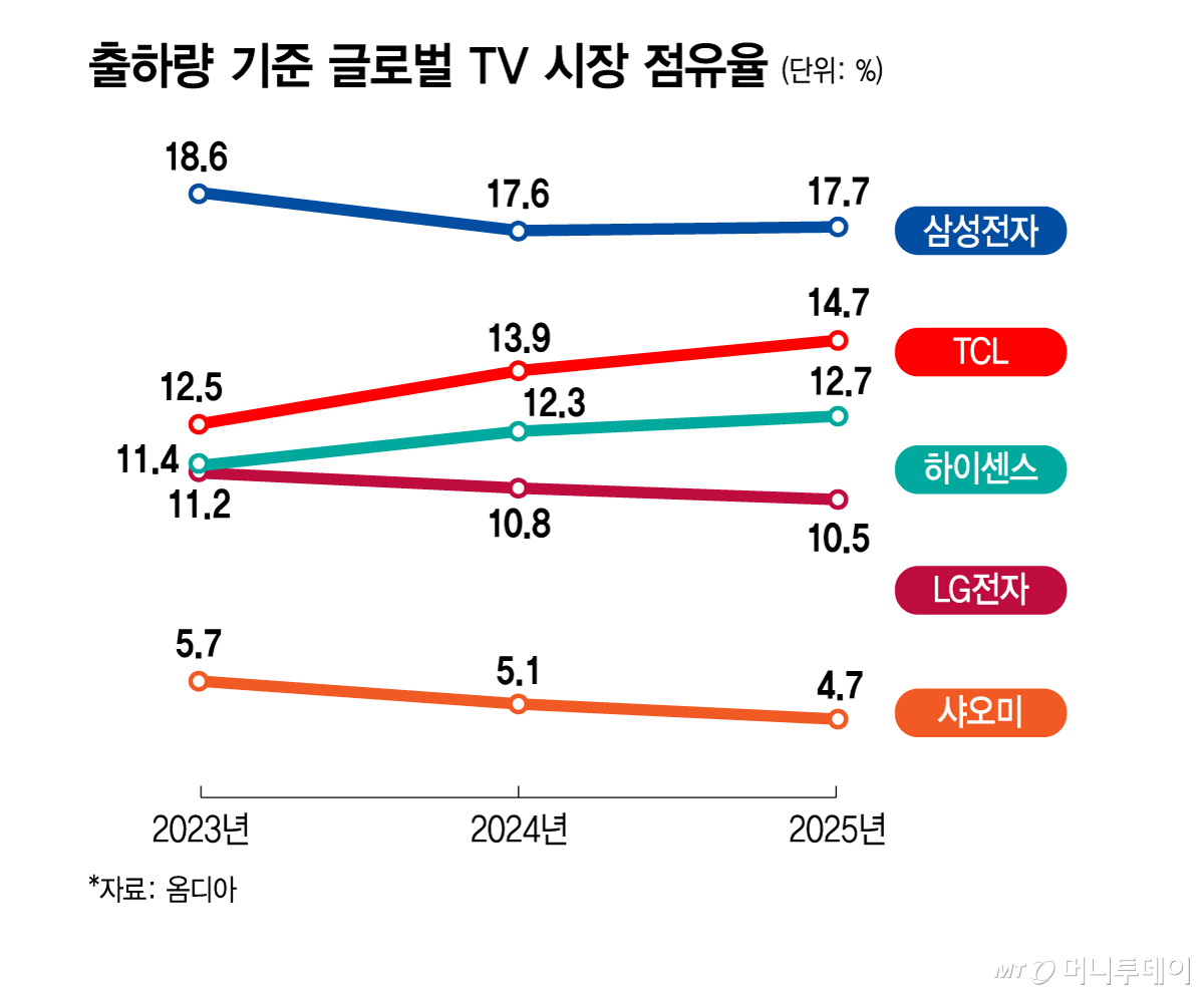 실제 매출 기준 점유율에서는 삼성전자와 LG전자가 지난해 각각 29.1%, 15.2%로 업계 1·2위를 차지하고 있지만 출하량 기준에서는 중국 기업이 바짝 추격하고 있다. 국내 기업의 글로벌 TV 출하량은 최근 3년간 소폭 감소한 반면 TCL은 2023년 12.5%, 2024년 13.9%, 2025년 14.7%로 상승세다. 하이센스 역시 2023년 11.4%, 2024년 12.3%, 2025년 12.7%로 점유율을 확대해왔다.