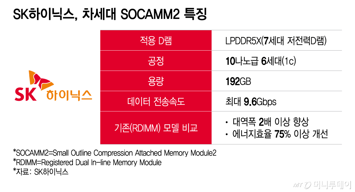 SK하이닉스는 "1c 공정을 적용한 SOCAMM2는 기존 RDIMM 대비 2배 이상의 대역폭과 75% 이상 개선된 에너지효율을 구현해 고성능 AI 연산에 최적화됐다"고 설명했다. 신형 SOCAMM2는 수천억 개의 파라미터를 갖는 초거대 AI모델의 학습과 추론 과정에서 발생하는 메모리 병목을 완화해 시스템 처리속도를 크게 높일 것으로 기대된다.