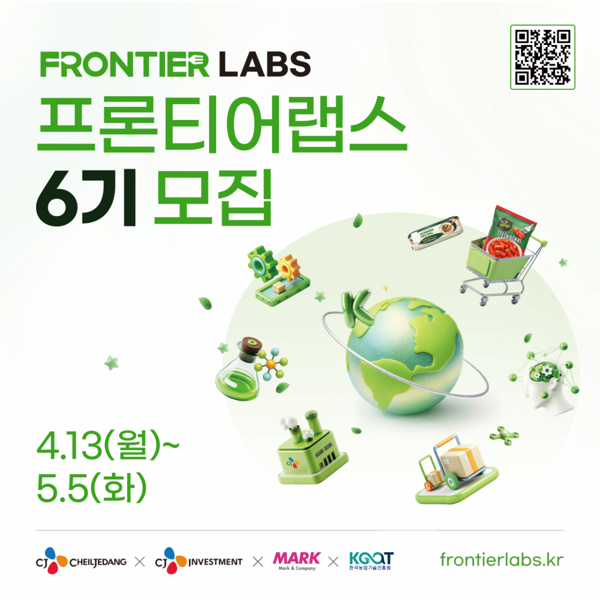 CJ제일제당이 전문 액셀러레이터 마크앤컴퍼니와 함께 식품 산업의 미래를 혁신할 스타트업 발굴 프로그램 '프론티어랩스(Frontier Labs)' 6기 참여 기업을 모집한다고 밝혔다.