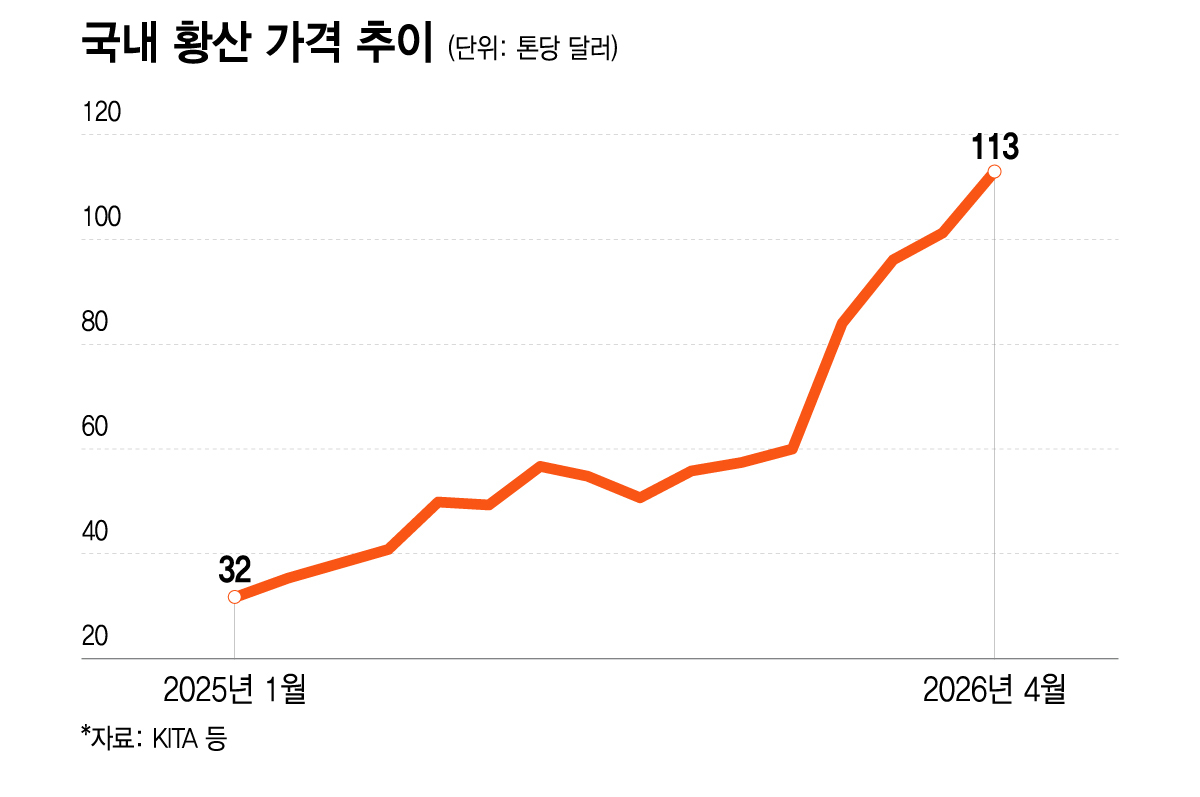 하지만 국제 제련기업들이 반사이익을 얻을 것이라는 전망이다. 중국이 중동산 유황 조달에 크게 의존하는 반면 한국은 비철금속 제련 과정에서 발생하는 이산화황을 회수해 황산을 생산하는 구조를 갖추고 있어서다. 관세청에 따르면 지난해 한국의 황산 수출량은 연간 239만톤에 달한 반면 수입은 약 1만1000톤에 그쳤다. 업계 관계자는 "한국이 황산 순수출국인 만큼 글로벌 가격 상승이 원가 부담보다는 판매단가 상승으로 이어질 가능성이 크다"고 예상했다.