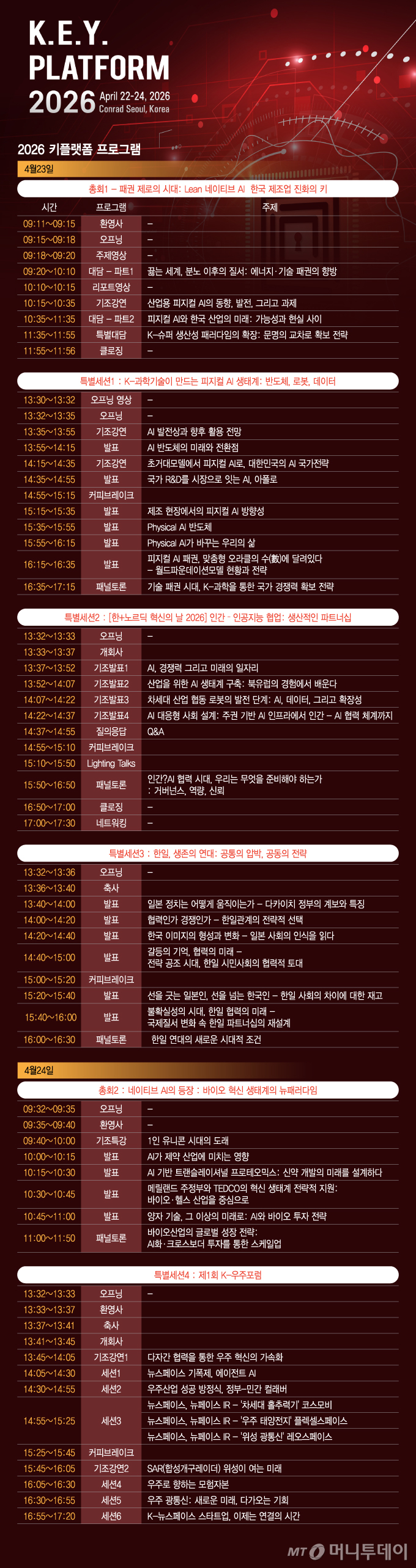 머니투데이 글로벌 콘퍼런스 '2026 키플랫폼'(K.E.Y. PLATFORM 2026)의 막이 올랐다. 시대를 관통하는 어젠다에 대해 예리한 분석과 효과적인 솔루션을 제시했던 키플랫폼은 올해 거대한 변혁을 일으키고 있는 피지컬 AI(인공지능)와 국제정세를 핵심 주제로 선정했다.