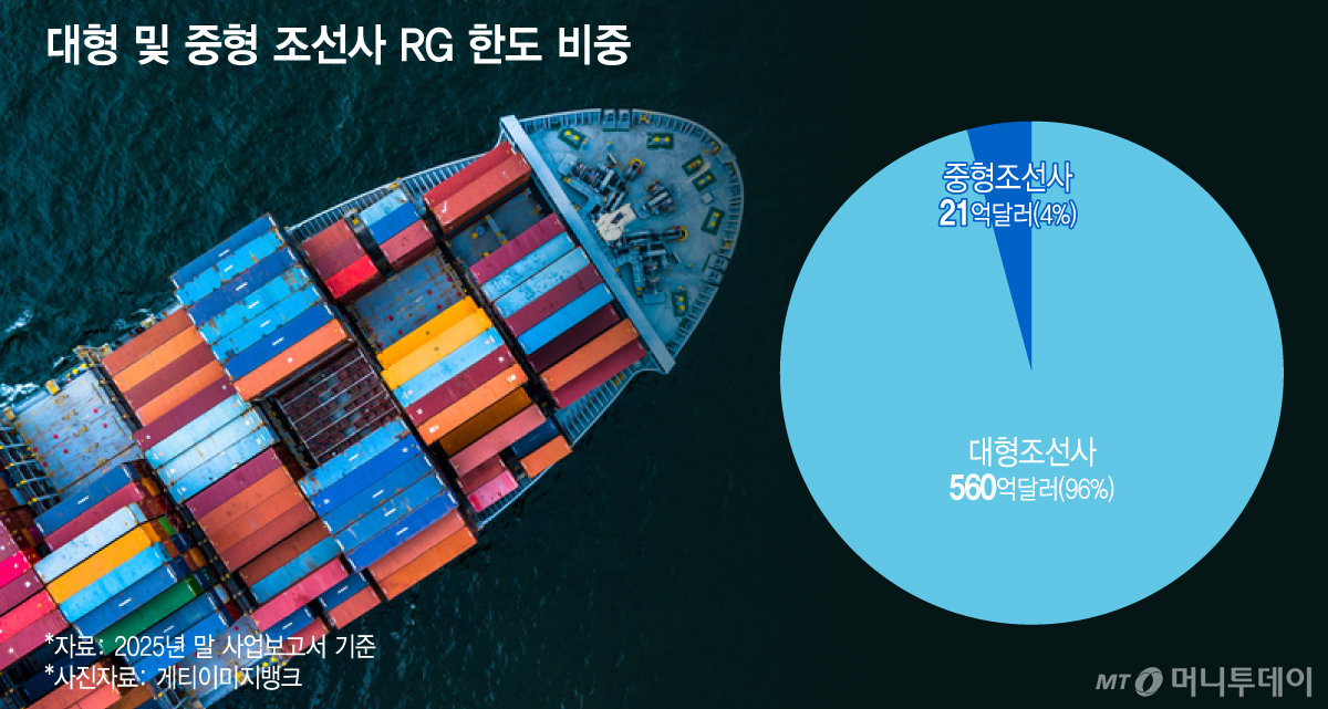 실제로 김영환 더불어민주당 의원실에 따르면 지난 5년간(지난해 10월 기준) 국책기관별 RG 발급은 총 57조7620억원에 달했는데 이 중 51조7203억원이 대형 조선사(HD한국조선해양(463,000원 ▲35,500 +8.3%)·삼성중공업(31,800원 ▲1,600 +5.3%)·한화오션(135,000원 ▲3,800 +2.9%))에 집중됐다. 중형 3사에는 6조417억원만 배정됐다. 특히 수출입은행의 경우 이 기간 동안 가장 많은 RG 발급(35조원 이상)을 했는데 이 중 2307억원만 중형 조선사로 돌렸다. 비중으로 따지면 0.7% 수준이다. 지난해 12월 일부 중형 조선사에 RG 발급을 재개한 것까지 합쳐도 1% 수준에 불과한 것으로 파악된다.