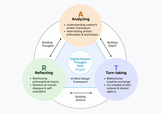 연구에는 두을 AI의 'Project SYN-METHEUS(프로젝트 신-메테우스)' 프레임워크가 적용됐다. 핵심 시스템인 디지털 휴먼 사고 트윈 'HIGGS'는 A.R.T. 프로세스(Analyzing·Reflecting·Turn-taking)를 바탕으로 인간과 실시간 상호작용하며 사고와 창작을 확장하도록 설계됐다.