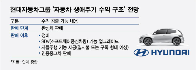 23일 관련업계에 따르면 과거 신차 판매와 정비 중심이었던 완성차 업체의 수익 창출 수단이 소프트웨어(SW) 업그레이드, AI 서비스 제공 등으로 확대되고 있다. 현대차(532,000원 ▼9,000 -1.66%)그룹도 SDV(소프트웨어중심차량) 상용화와 자율주행 서비스 등에 대한 수익을 점차 늘려갈 것으로 보인다.