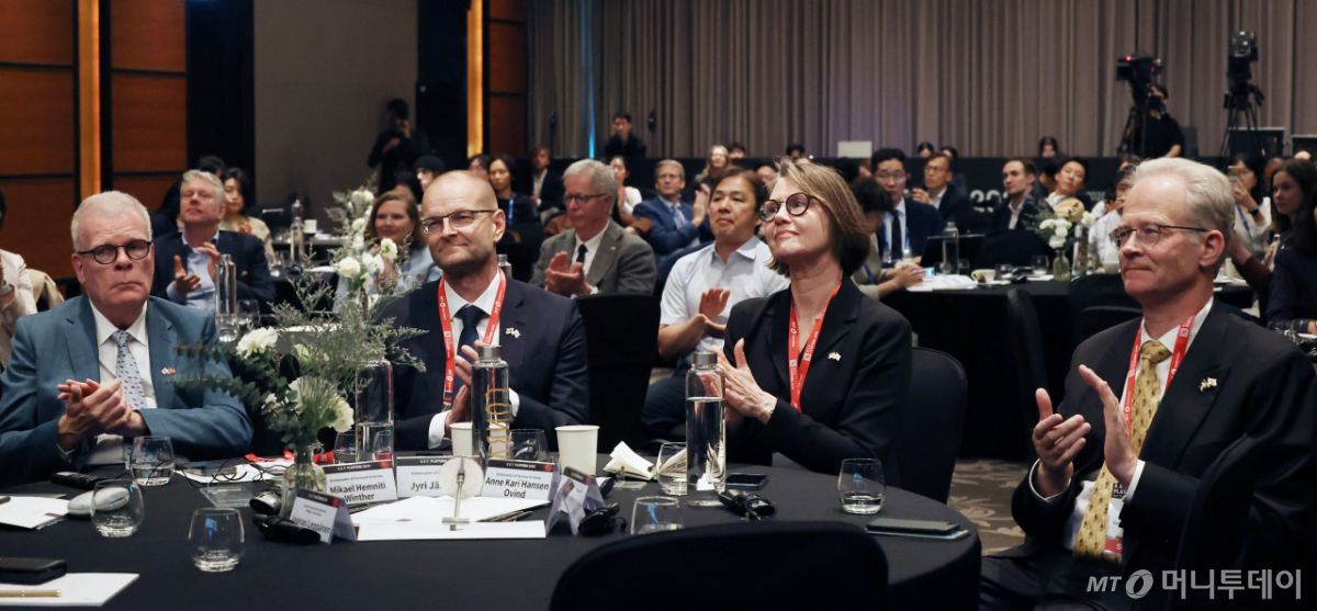 미카엘 헴니티 빈터 주한덴마크대사(왼쪽부터), 유리 에르비야호 주한핀란드대사, 안네 카리 한센 오빈 주한노르웨이대사, 칼-울로프 안데르손 주한 스웨덴대사가 23일 영등포구 콘래드 서울에서 머니투데이 주최로 진행된 '2026 키플랫폼' 특별세션2 '[한+노르딕 혁신의 날 2026] 인간-인공지능 협업: 생산적인 파트너십'에서 박수를 치고 있다. 독자들의 PICK! 허니문 베이비 '출생의 비밀'...결혼 직전 전남친 만난 아내 소유, 임영웅과 '제주도 열애설' 전말 공개 '음주 뺑소니' 김호중, 옥중 50억 돈방석?…지분가치 '반전' 남편 방에 정력제..."아들아, 인생 즐겨" 불륜 응원한 시모