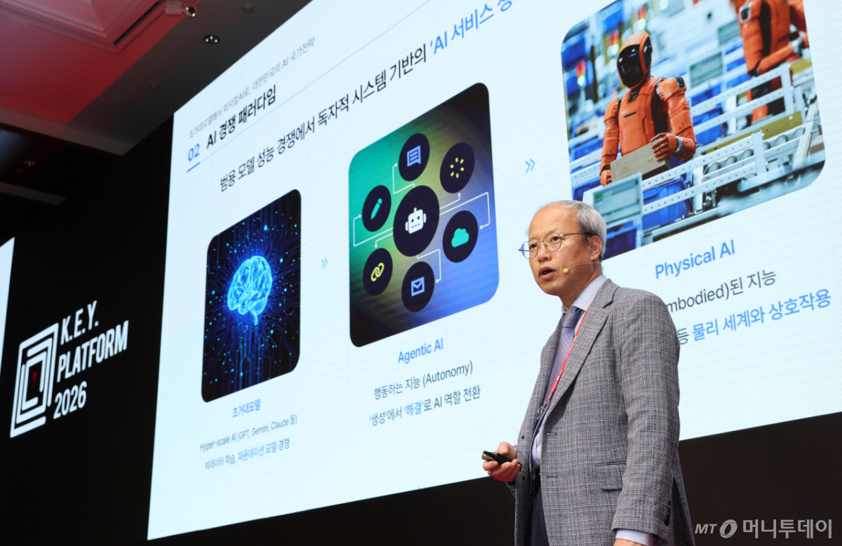 황지호 한국과학기술기획평가원장 직무대행이 23일 영등포구 콘래드 서울에서 머니투데이 주최로 진행된 '2026 키플랫폼' 특별세션에서 '초거대모델에서 피지컬 AI로, 대한민국의 AI 국가전략'에 대해 기조강연을 하고 있다. 독자들의 PICK! 허니문 베이비 '출생의 비밀'...결혼 직전 전남친 만난 아내 소유, 임영웅과 '제주도 열애설' 전말 공개 '음주 뺑소니' 김호중, 옥중 50억 돈방석?…지분가치 '반전' 남편 방에 정력제..."아들아, 인생 즐겨" 불륜 응원한 시모