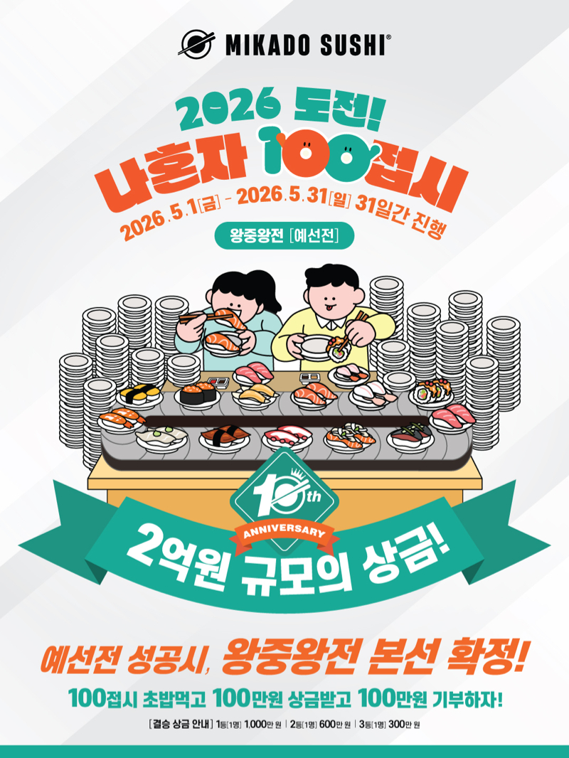 이번 행사는 총상금 2억 원 규모로, 참가자가 60분 내 초밥 100접시를 완식할 경우 1인당 100만 원의 상금을 지급한다. 동시에 동일 금액을 어려운 이웃에게 기부하는 구조를 도입해 이벤트와 사회공헌을 결합한 것이 특징이다.