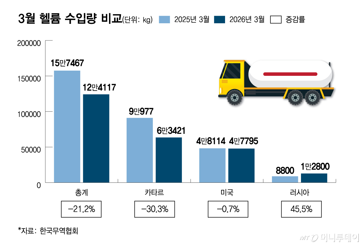 최근 중동전쟁 여파로 카타르 최대 헬륨 산업단지 가동이 중단되면서 업계에서는 반도체 생산차질 우려가 나왔다. 한국의 카타르산 헬륨 의존도는 약 65%(2025년 기준)에 달한다. 실제 지난 3월 헬륨 수입량은 12만4117㎏으로 지난해 같은 기간 대비 21.2% 감소했다.