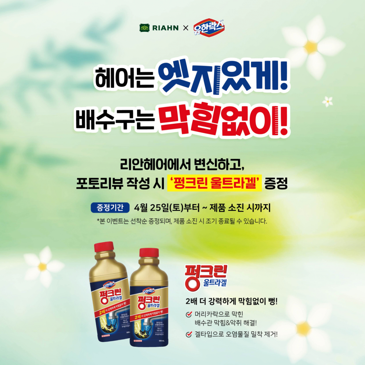 이벤트는 리안헤어 가맹점 방문 고객을 대상으로 진행되며, 시술 후 네이버 등 온라인 채널에 포토리뷰를 작성한 고객에게 유한클로락스의 대표 배수구 세정제 '유한락스 펑크린 울트라겔'을 증정한다.