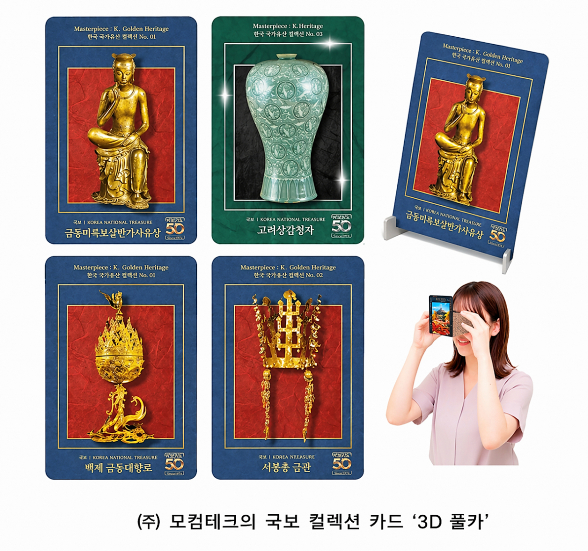 3D영상 전문기업 ㈜모컴(대표 최해용·최보미)은 자사 특허 기술 '3D 폴카'를 적용한 국보 컬렉션 카드를 선보인다고 밝혔다. 1차 시리즈는 반가사유상, 신라 서봉총 금관, 백제 금동대향로, 고려청자 등 4종으로 구성되며 향후 국립박물관 소장 국보 약 100여 점을 대상으로 순차적으로 시리즈화 할 계획이다.