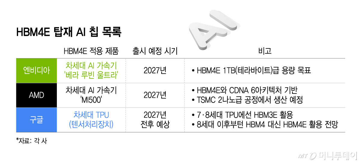 AMD는 내년 선보일 '인스팅트 MI500'에 HBM4E를 탑재한다. 리사 수 CEO(최고경영자)는 지난 1월 미국 라스베이거스에서 열린 세계 최대 IT·가전 전시회 'CES 2026' 기조연설에서 "인스팅트 MI500은 CDNA 6 아키텍처와 HBM4E를 기반으로 TSMC의 2나노급 공정에서 생산될 예정"이라고 밝혔다. 구글 역시 차세대 TPU(텐서처리장치)에 HBM4E 채용을 검토 중인 것으로 전해졌다.