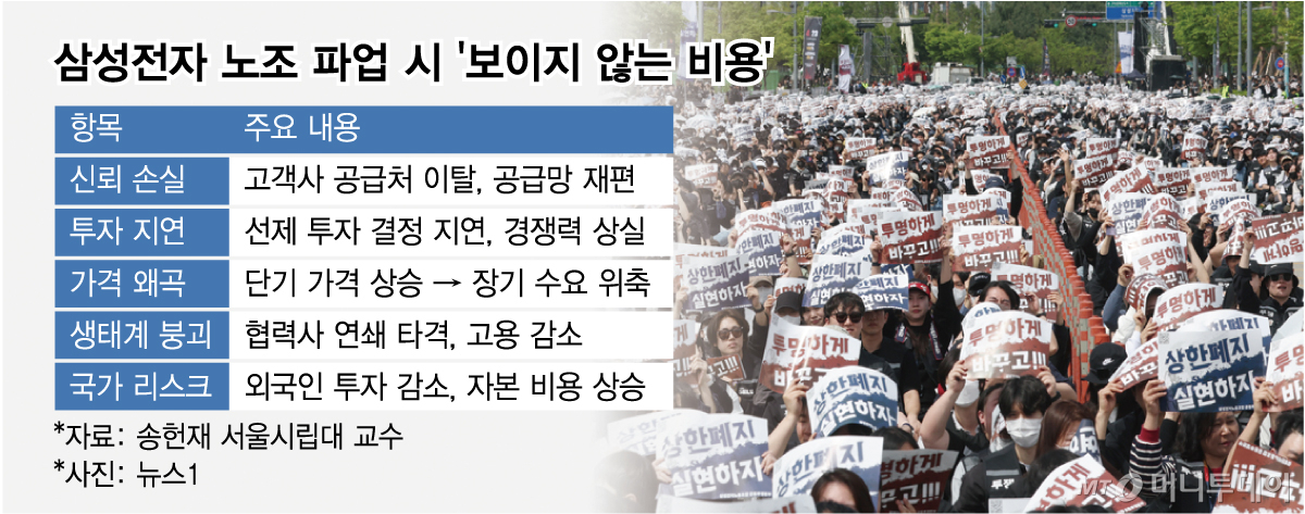 송 교수는 "파업은 장부에 반영되는 생산차질보다 훨씬 깊고 치명적인 '구조적 비용'을 발생시키는 과정"이라고 지적했다. 그는 △고객사 이탈과 공급망 재편 등 신뢰손실 △투자지연과 경쟁력 약화 △단기가격 왜곡 △협력사 생태계 붕괴 △외국인 투자감소와 자본비용 상승 등을 '보이지 않는 비용'으로 꼽았다.