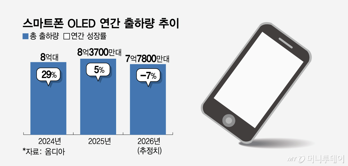 27일 시장조사업체 옴디아에 따르면 올해 스마트폰 OLED(유기발광다이오드) 패널 출하량은 지난해 대비 7% 감소한 7억7800만대로 예상된다. 지난해 하반기 이후 메모리 가격이 급등하면서 부품 비용 증가와 수요 둔화 흐름이 나타나고 있다는 분석이다.