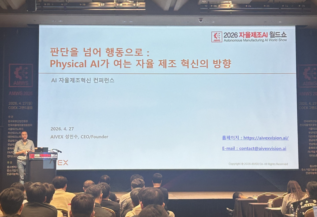 산업용 피지컬 AI 기업 아이벡스(AIVEX)가 27일 코엑스(COEX)에서 열린 '자율 제조 AI 월드쇼(AMWS 2026)' 기조강연에서 '피지컬 AI 모델×데이터 폐쇄 루프 플랫폼'을 공개했다고 밝혔다.