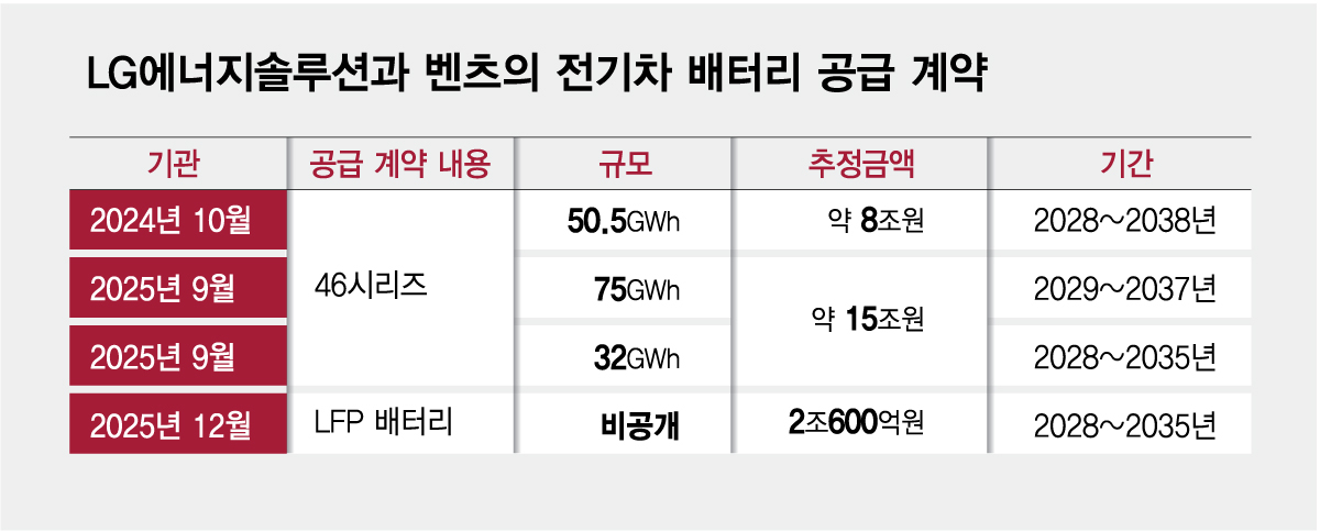 28일 배터리업계에 따르면 LG에너지솔루션은 벤츠와 △2024년 10월 50.5GWh(기가와트아워) △2025년 9월 75GWh △2025년 9월 32GWh의 배터리 공급 계약을 체결했다. 금액으로 따지면 총 23조원 규모다. 여기에 지난해 12월 2조600억원의 수주를 더했다. 양사간 관련 계약 규모가 약 2년 사이에 총 25조원대까지 확대된 것이다.