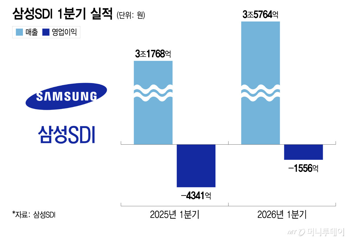 삼성SDI는 올 1분기 매출이 3조5764억원, 영업손실은 1556억원을 기록했다고 28일 공시했다. 지난해 같은 기간과 비교해 매출은 12.6% 증가했고 적자 규모는 64.2% 줄어들었다. 다만 흑자 전환에는 실패하면서 2024년 4분기 이후 6개 분기 연속 적자를 기록하게 됐다.