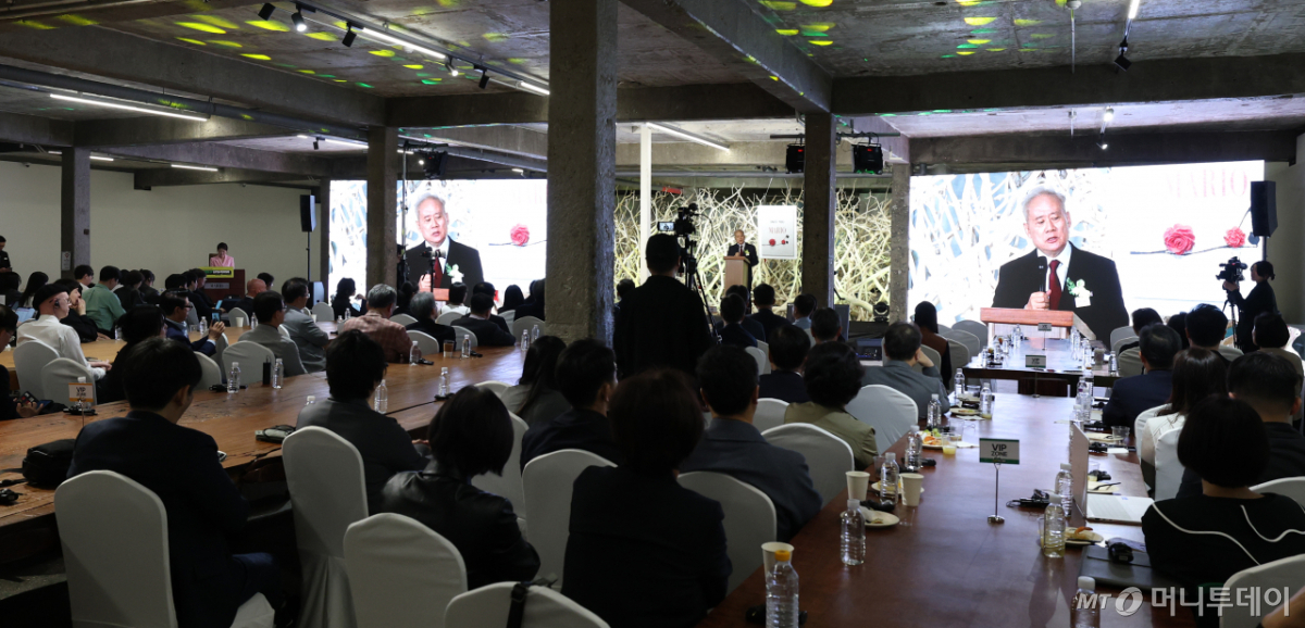 홍석열 마리오아울렛 회장이 29일 서울 금천구 마리오 까르뜨니트 공장에서 열린 마리오아울렛 'MGM IP UNIVERSE 2026' 프로젝트 공개 기념식에서 인사말을 하고 있다.