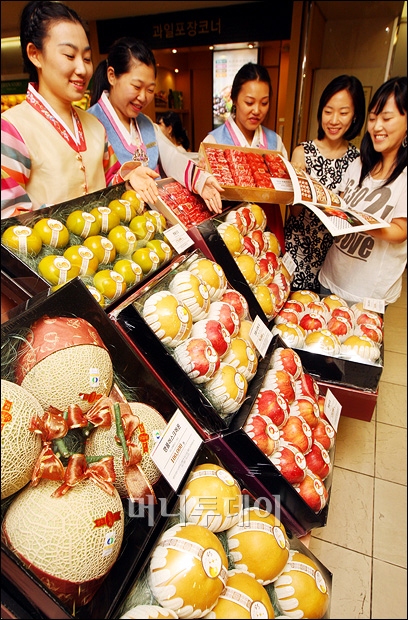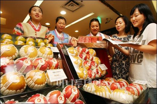 추석을 앞둔 29일 오전 현대백화점 신촌점에서 판매직원들이 전통한복을 입고 고객들에게 과일, 한우 등의 다양한 선물세트를 선보이고 있다. 현대백화점에서는 추석명절을 맞이해 다음달 7일까지 구매금액별 상품권을 지급한다고 밝혔다. 독자들의 PICK! 장윤정 모친 "'두 번 이혼' 딸, 제일 속상…연하 사위 원해" "시부모 수발들면 30억 아파트 줄게"...30대 며느리는 거절 이호선, 무속 예능 1회 만에 하차한 이유..."내가 나설 길 아냐" '암 투병' 박미선 만난 선우용여 "네가 딸, 가족은 설날 연락도 없어"
