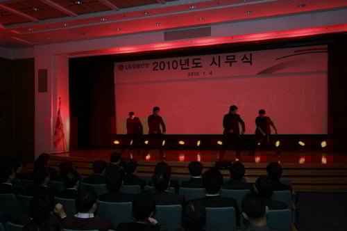 사회자의 개회사로 시무식이 시작될 때만 해도 여느 시무식과 다를 게 없었다. 그런데 사회자가 "올해는 특별한 공연이 마련돼 있다"고 말하면서 무대 위로 이목이 집중됐다.