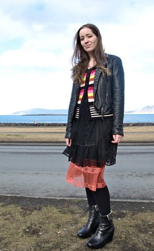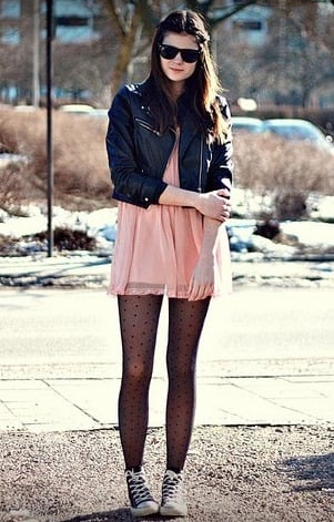 오늘 본 것중 개인적으로 가장 맘에 드는 코디에요! '라이더자켓 + 살구빛 미니 쉬폰드레스로 포인트! + 빈티지 도트무늬 스타킹 + 컨버스 + 선글라스'. 트렌디함과 빈티지룩을 조화시킨 센스가 돋보이죠?
