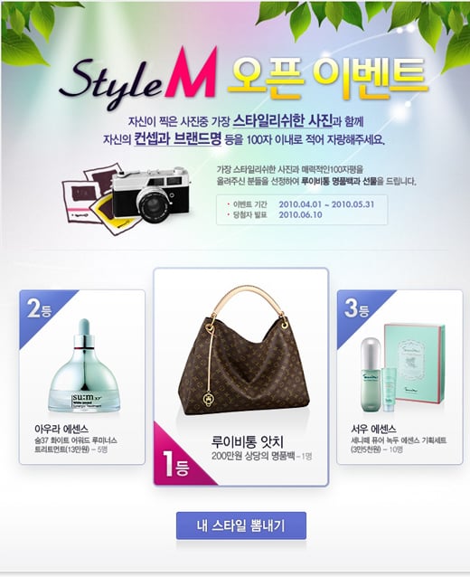 -이벤트 경품: 1등 고급 핸드백(루이뷔통 앗치백), 2·3등 기능성 화장품 15개