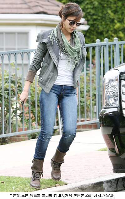 그럼 어떻게 뉴트럴 컬러를 잘 소화해 볼까요? 자기에게 맞는 뉴트럴 컬러를 골랐다면 1단계, 뉴트럴 컬러에 떠도는 색감을 보세요. 그리고 그보다 진한 색을 더하세요. 푸르스름한 회색이면 진한 파랑 아이템을, 탁한 연초록이면, 청록색 아이템을 받쳐 입는 것이죠. 딱히 색을 맞춘 것 같지도 않은데 굉장히 세련돼 보여요.