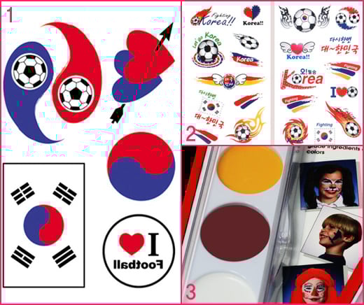 친구들과 가족들이 함께 얼굴이나 팔에 그릴 수 있는 분장용품, 태극모양은 그리 어렵지 않아 전문가가 아니어도 쉽게 그릴 수 있다.