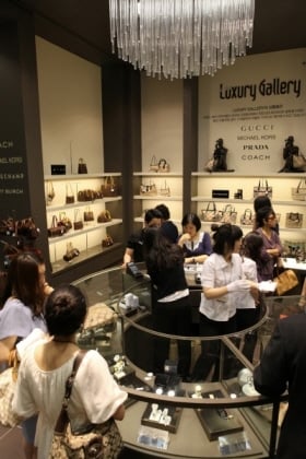 무엇보다 이랜드가 자신 있어 하는 직매입 명품샵, '럭셔리 갤러리' 입구에는 입장을 위해 줄을 선 쇼핑객들이 눈에 띄었다. 이곳에는 마이클코어스와 코치, 버버리, 프라다, 루이비통, 발렌시아가 등 명품 브랜드의 핸드백화 선글라스, 시계 등이 대폭 할인된 가격에 판매돼 개장 전부터 관심을 모았다.