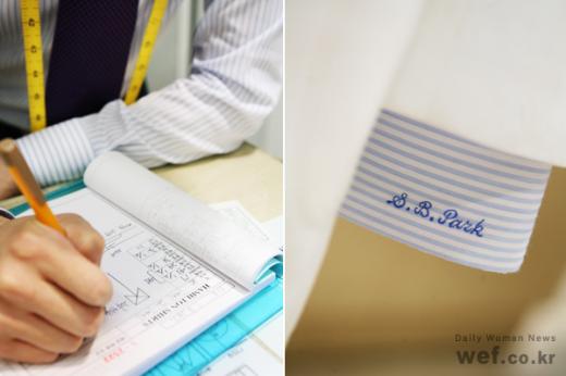 원단을 골랐으면 이제 사이즈를 잴 차례. 타이트한 핏이 유행이라 소매통까지 꼼꼼하게 재어준다. 셔츠 칼라와 소매, 등주름까지 고르고 나면 이니셜과 단추를 고민해야 한다. 이니셜은 글자 종류가 2~3개 준비되어 있으며, 단추는 흰색의 기본 타입이 가장 무난하다.