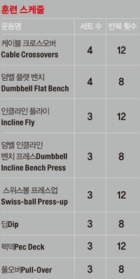 가슴고립운동을 실시한 뒤 휴식 없이 바로 여기 나와 있는 슈퍼세트를 실시한다. 본격적인 운동에 앞서 고립운동을 함으로써 슈퍼세트를 하는 동안 가슴근육에 더 큰 자극을 받을 수 있게 된다.