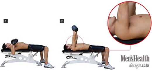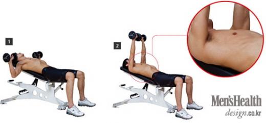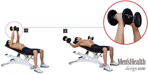2 머리를 포함한 상체가 벤치에서 떨어지지 않도록 주의하며 팔을 수직으로 밀어올린다. 연구에 따르면 이 운동은 윗가슴 근육의 85%에 자극을 주는 효과가 있다고 한다.