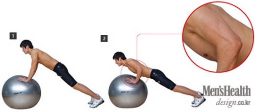 2 팔꿈치를 구부리며 상체를 낮춘다. 등이 구부러지지 않도록 주의하라. 스위스볼의 불안정함은 내부 근육 단련에도 도움이 된다.