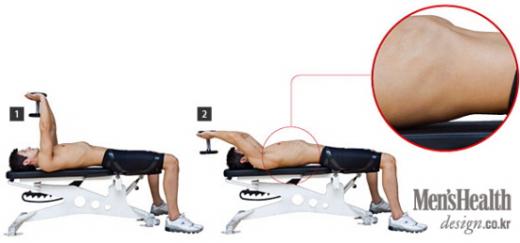 2 등이 벤치에서 떨어지지 않도록 주의하며 팔을 가능한 한 멀리 벌리며 내린다. 시작 자세로 돌아갈 때도 아치를 크게 그린다. 애인을 양팔에 꼭 안는다고 생각하라.