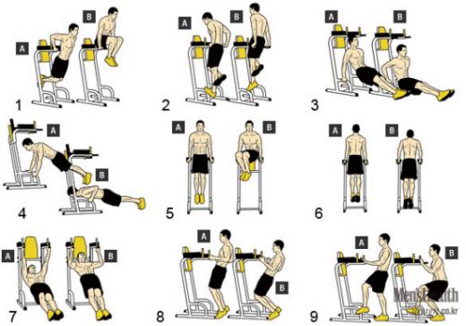 딥 머신을 등지고 서서 양손잡이를 잡고 팔로 몸을 띄운다. 팔을 포함해 몸 전체를 쭉 편다(A). 무릎을 90 구부리며 허벅지가 바닥과 평행을 이룰 때까지 다리를 들어올리고 하체를 좌우로 한 번씩 움직인 후(B) 시작 자세로 돌아온다. 6회씩 4세트 실시한다. 효과부위 복근, 복사근