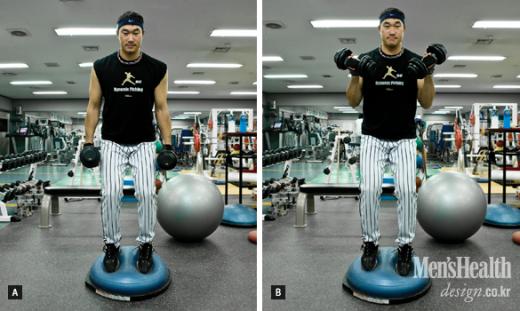 B. 상체가 흔들리지 않도록 주의하며 덤벨을 들어올린다. “투수가 와인드업을 할 때는 몸 전체가 불안정합니다. 지면의 불안정함을 연출하기 위해 발밑에 보수볼Bosu Ball을 대고 운동합니다.” 김용일 코치의 말이다.
