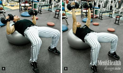 대흉근 발달에 효과 김용일 코치는 “스위스 볼 위에서 운동을 하면 대흉근 주위의 근육도 긴장이 돼 투구 시와 유사한 효과를 얻을 수 있습니다”라고 말했다.