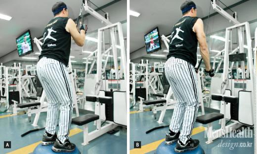 A 허리를 15 숙이고 겨드랑이를 붙인 채 선다. 마운드 위의 상황을 연출하기 위해 봉중근 선수는 보수볼Bosu Balll 위에서 운동한다.