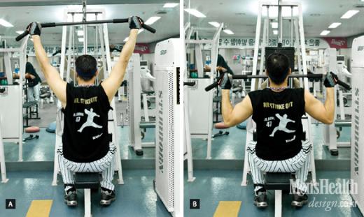 A. 랫풀다운 머신에 앉아 어깨 너비보다 한 뼘 가량 넓게 바를 잡는다.