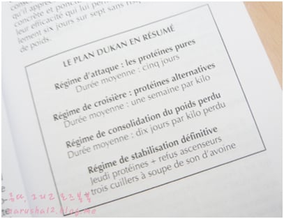 다이어트의 이론을 잠시 설명하자면, 먹을 수 있는 음식을 단백질로만 제한하되 무제한으로 해서 몸의 단백질은 유지하면서 활동에너지는 몸의 지방에서 얻게 하는, 그래서 결국 몸의 지방을 태우게 하는 다이어트 방법입니다. 총 4단계로 나누어져있고 중요한건 단계별로 지정된 음식만 먹어야 된다는 거예요. 그 안에서는 마음껏 먹을 수 있어요.