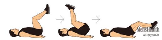 리버스 크런치 1 바닥에 눕는다. 다리를 90 각도로 꺾어 들어올린다. 2 허벅지가 무릎에 닿도록 다리를 끌어올린다. 3 무릎을 펴면서 다리를 내린다. 발이 땅에 닿지 않도록 주의한다. 운동 부위 복부 아래쪽