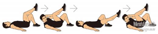 사이드 크런치 1 바닥에 누운 채 오른쪽 다리를 들어올린다. 왼손 끝을 관자놀이에 갖다댄다. 2 몸을 비틀며 왼쪽 팔꿈치를 오른쪽 무릎에 댄다. 반대쪽도 같은 방법으로 실시한다. 운동 부위 복부 양옆