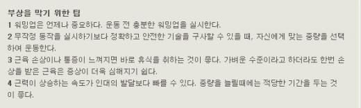 사랑이 지나치면 병이 나고 음식도 과하면 탈이 나기 마련이다. 운동도 예외일 리 없다. 앞뒤 안보고 밀어붙이는 무리한 운동은 결국 부상으로 이어진다. 동작별, 부위별 발생할 수 있는 부상의 종류와 예방법을 알아보자.